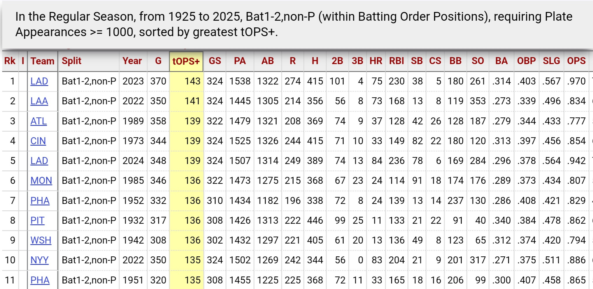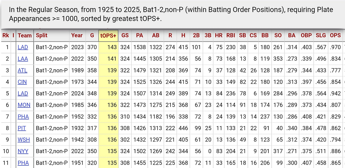 Ohtani + Tucker: That was one of my first thoughts after reading the news of the agreement between Tucker and the Dodgers. Then, digging into some numbers, this is what I thought to look for: how good have the Dodgers’ #1 and #2 hitter duos been in a single season over the last 100 years? You have to see this: