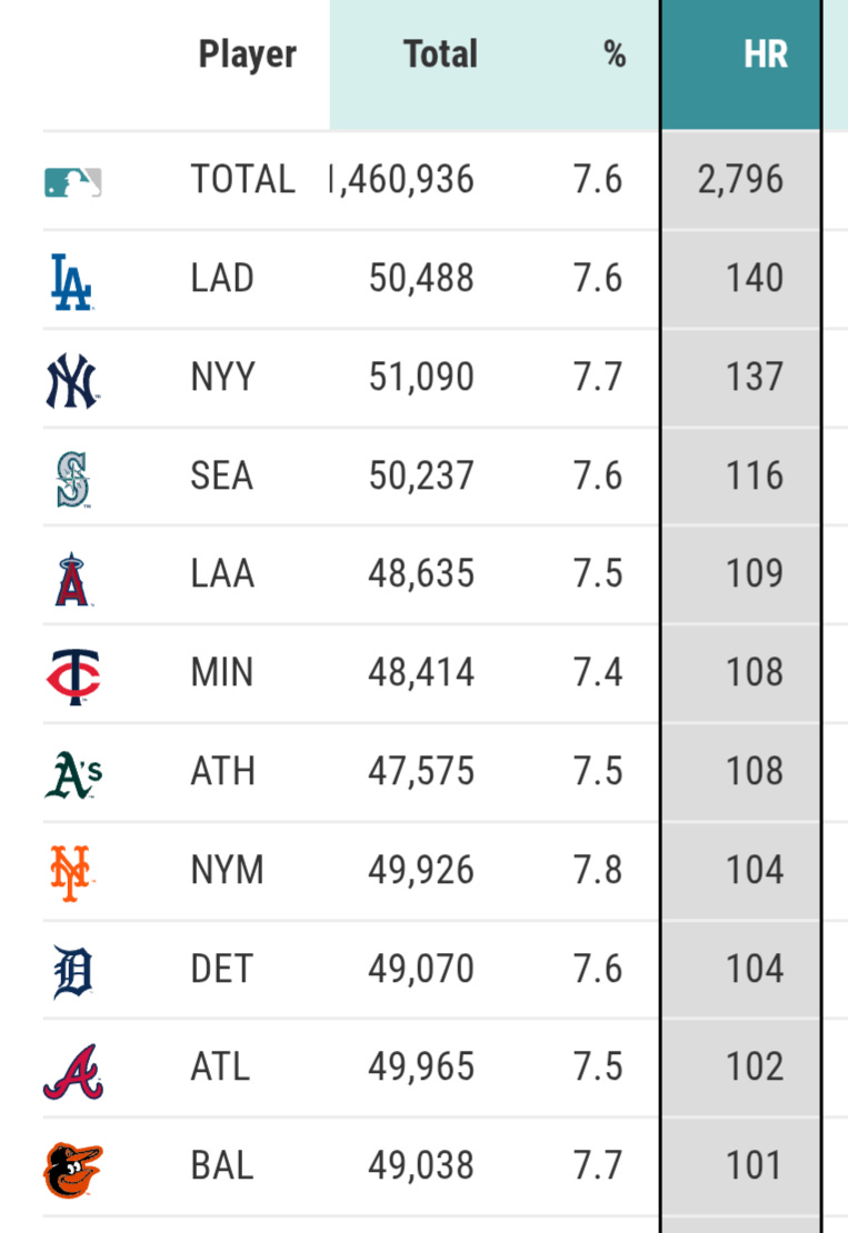 No team in MLB has hit more home runs on pitches left over the heart of the plate than the Dodgers, who have punished those mistakes with 140 homers. The Yankees follow with 137, and Seattle sits further back at 116.